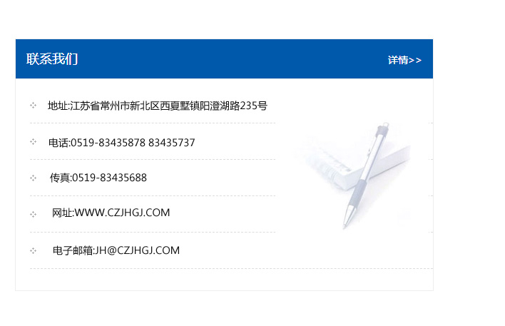 地址:常州市新北區友邦商務大廈1幢16、17層  電話:0519-85101652  傳真:0519-85112595  郵編:213022  網址:www.cz-jiayue_cn.51microprogram.com  郵箱:xiajifengaa@163.com